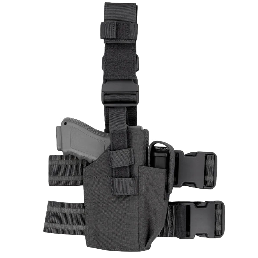 The Tactical Leg Holster offers versatility and durability with a semi-rigid construction that securely fits most medium to large pistols. A built-in pistol mag pouch with an adjustable flap ensures additional ammo is within easy reach, while the fully adjustable leg strap with non-slip rubber lining and quick-release buckle provides a custom fit and quick access.