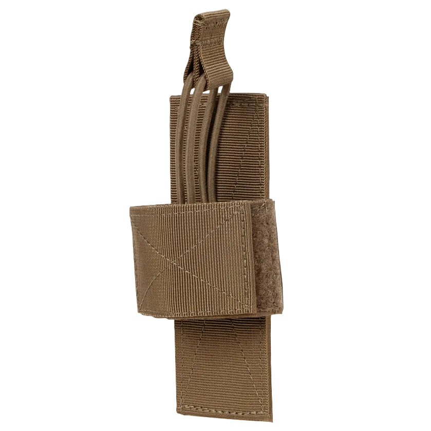 The Universal Holster features a classic wrap-around design that fits a wide range of pistols. It securely attaches to any loop surface, ensuring stability and quick access. The built-in bungee cord retention system enhances security while allowing for rapid weapon deployment.